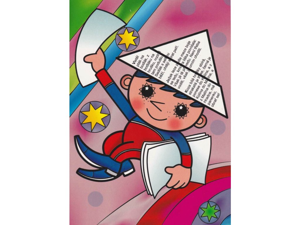 Kreslený chlapeček Večerníček v papírové čepici, jehož autorem je malíř Radek Pilař.