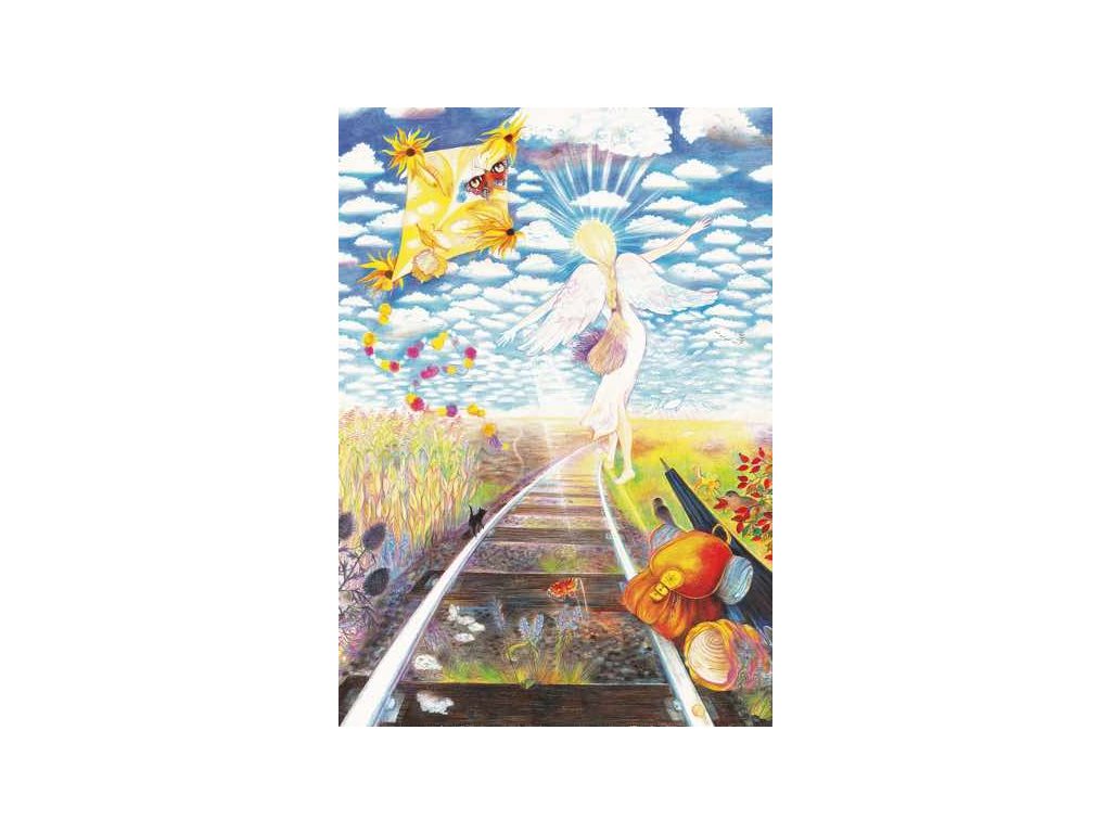 Popis obrazu: Anděl poutníků je strážný anděl na cestě naším životem. Přináší nám ochranu a medicínu odvahy vydat se za svým snem a překročit hranice známého světa i tam, kde se cesta zdá trnitá. Koleje jsou cestou pro tělo, sluneční paprsek cestou pro duši, životní cesta by měla být cestou rovnováhy mezi duchem a hmotou. Cesta nás může naučit víc než dosažený cíl. Šťastné cesty a šťastné návraty!