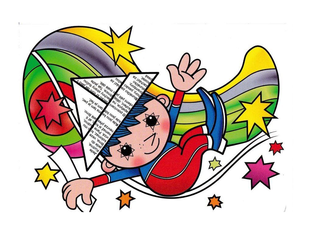 Kreslený chlapeček Večerníček v papírové čepici, jehož autorem je malíř Radek Pilař.